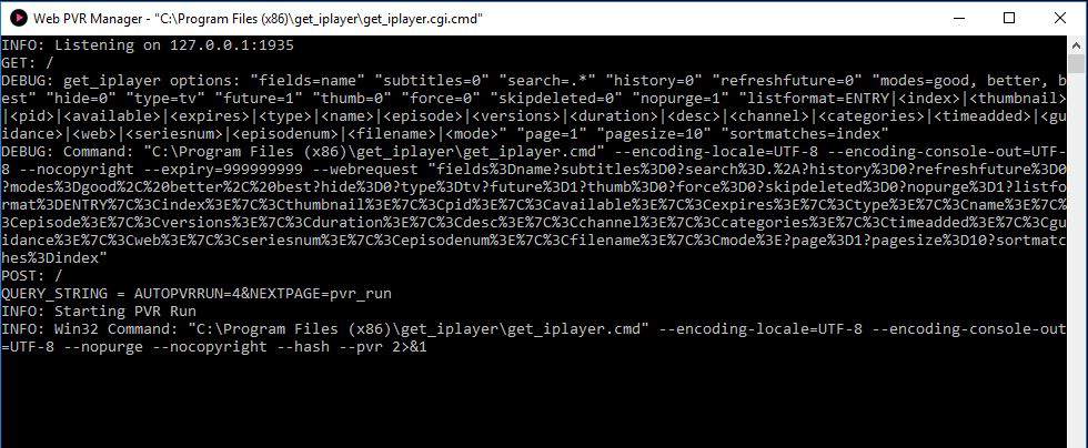 INFO: Win32 Command: "C:\Program Files (x86)\get_iplayer\get_iplayer.cmd" --encoding-locale=UTF-8 --encoding-console-out=UTF-8 --nopurge --nocopyright --hash --pvr 2>&1I am using