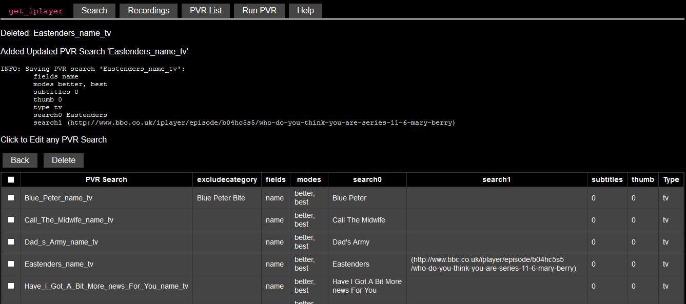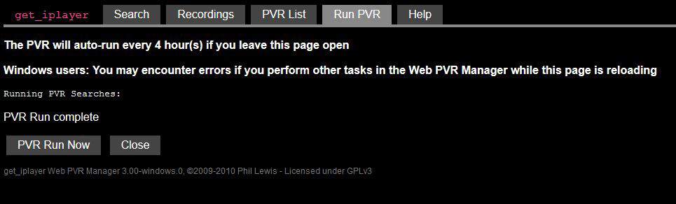 The Web PVR Manager was working fine upto a day ago, when I pressed the 'Run PVR' a new tab opened and get_iplayer was 'Running PVR searches' as listed in my PVR list and I could see the program looking for programmes. When a new programme was found it started downloading no problem.